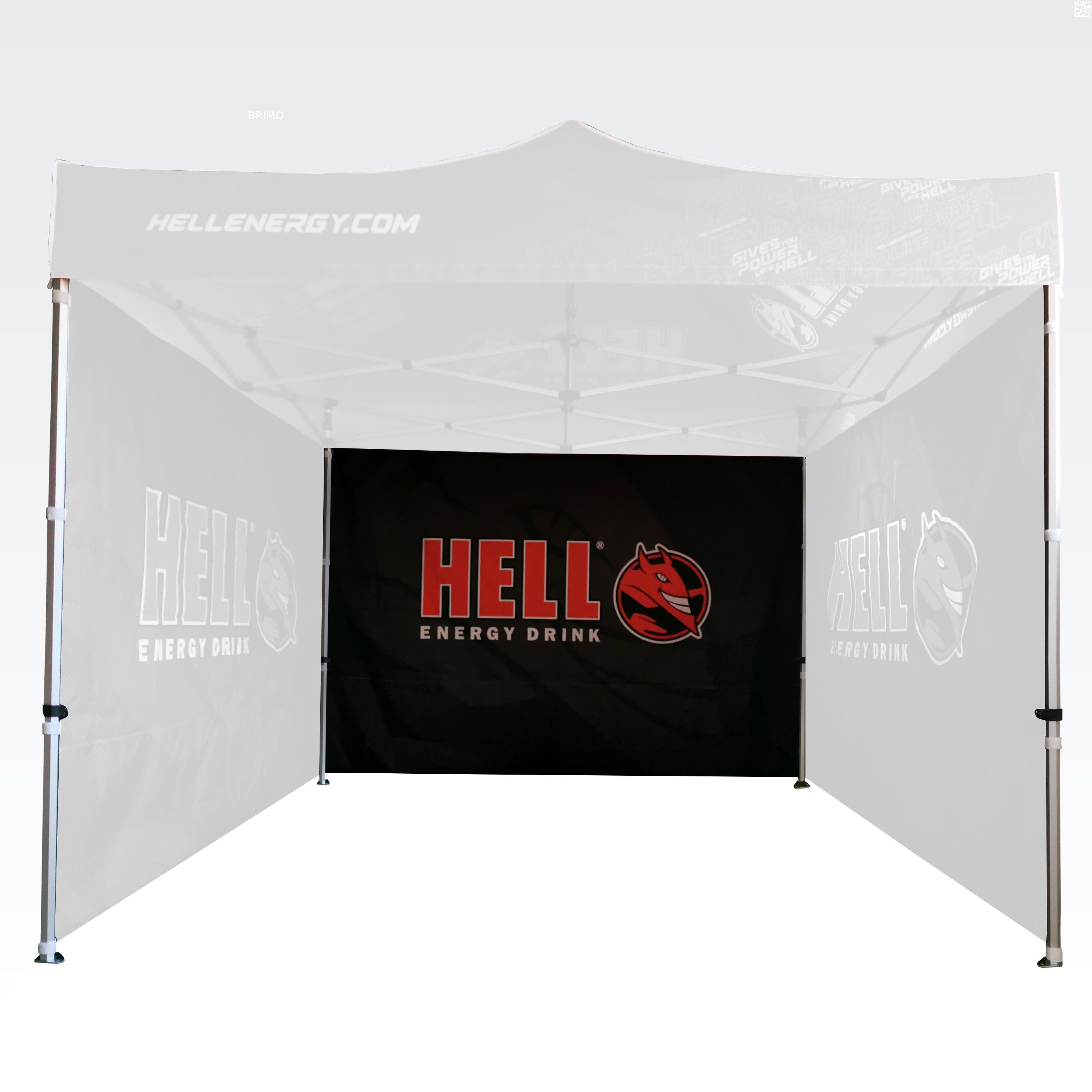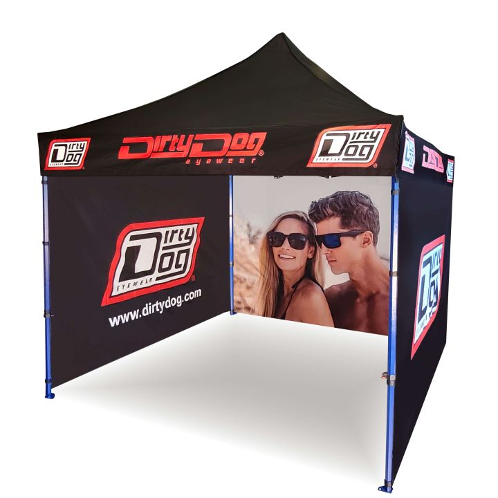 Reklameskure med digital sublimationsprint. Trykket udføres via en kemisk proces, hvor blækket trænger direkte ind i stoffets struktur under høje temperaturer. Logo, tekst eller enhver form for grafik på indersiden eller ydersiden af skuret efter kundens ønske.
